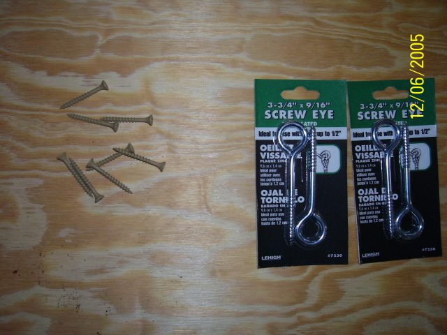 Use a piece of scrap 2" x 4" (approximately 7 1/2" long) to make block for eye hooks. Screw eye hooks in horizontally at the front (3 1/2" end). Screw to plywood from the bottom. |